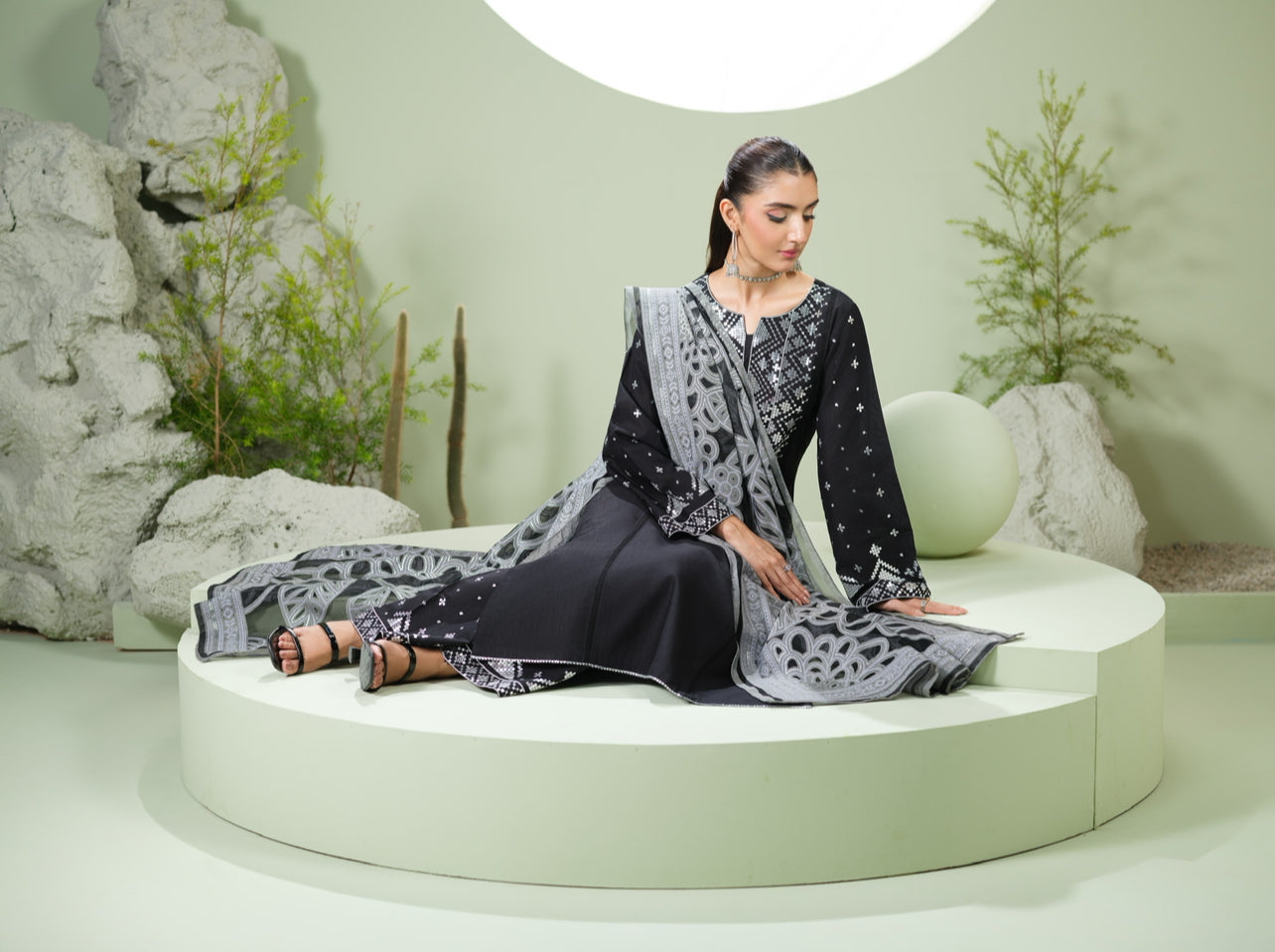 This Air Jet Soft Khaddar shirt is beautifully fully sequence embroidered, including on the arms and sleeves. It also has beautiful lacework on the Daman.
