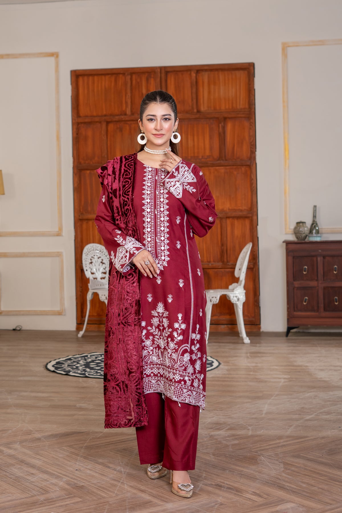 3 Piece Ready To Wear Embroidered Linen Suit With Plachi Shawl -TT-13-