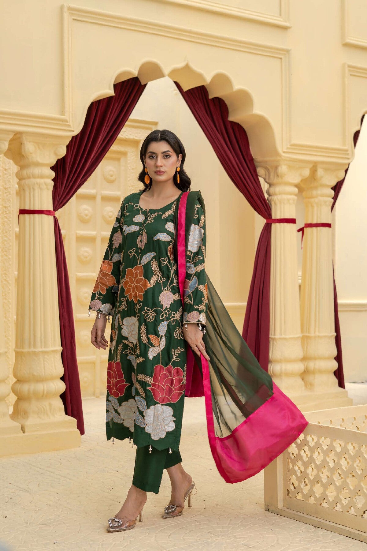 This 3-piece embroidered linen suit features a beautifully Fully Embroidered detailed shirt, matching trousers, and a lightweight chiffon dupatta with a stylish border. 🌸