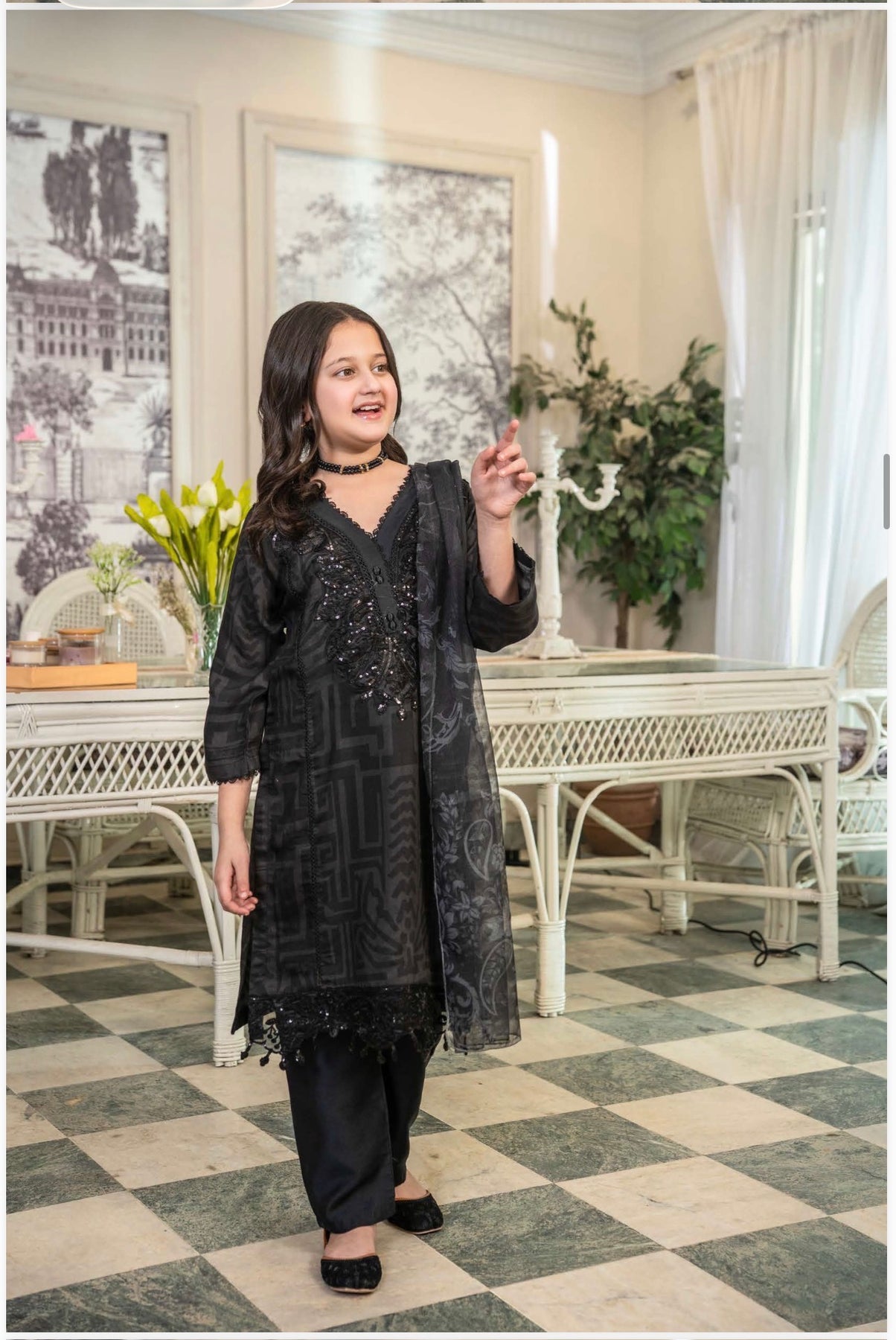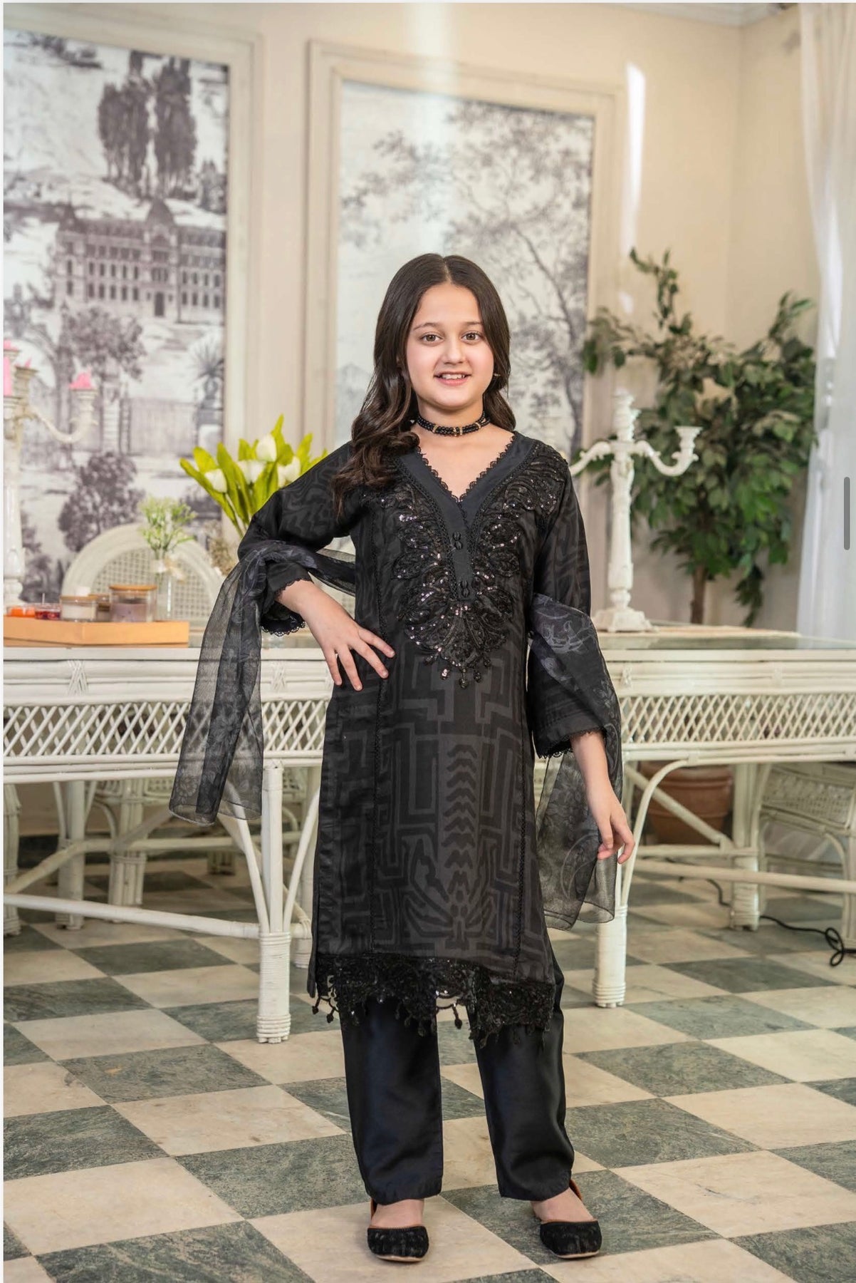 Radiant mustard yellow with rich gold embroidery and delicate lace trims, this matching mother-daughter festive collection is pure elegance. Designed for perfect twinning moments, the set features a flowy embroidered tunic, straight pants, and a sheer dupatta for mom, paired with a charming shorter version and headband for your little girl.