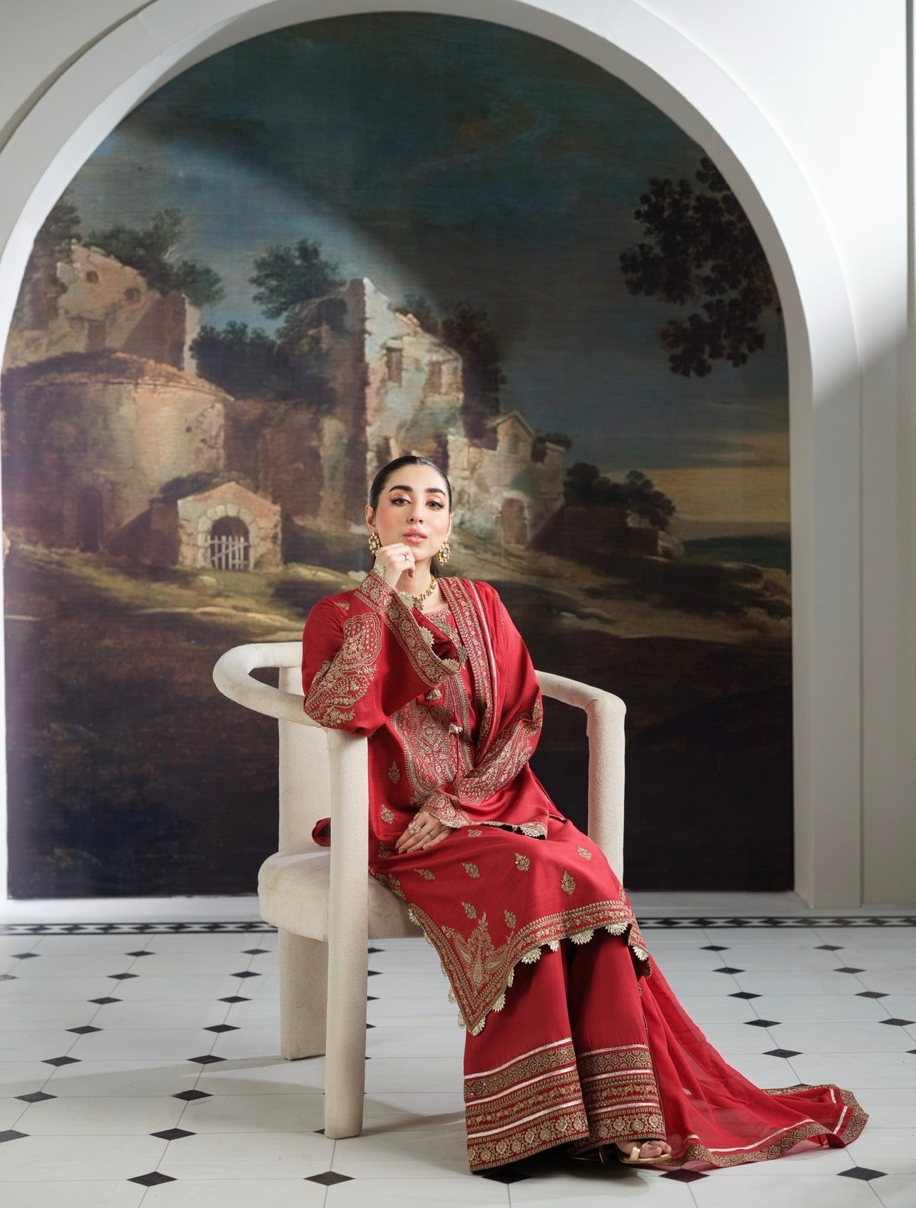 The set comes with a beautiful Chiffon embroidered dupatta.
